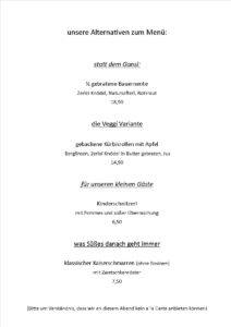 aktuelle Speisekarte und Besonderheiten auf Bestellung Mittagsteller Woche 42 Empfehlung vom Wirt - es wird "Wild" Weine und SchnäpseWir haben Dienstag bis Samstag von 11:30 – 14:00 (Küche bis 13:30) und von 17:00 – 22:00 (Küche bis 20:00) geöffnet, Sonntag, Montag und Feiertag haben wir geschlossen.